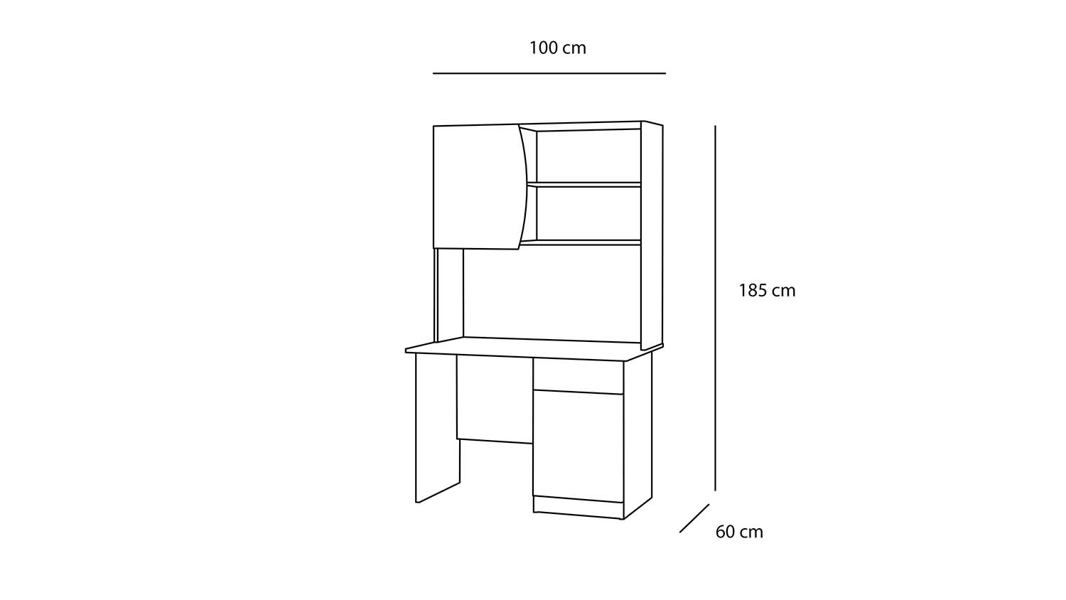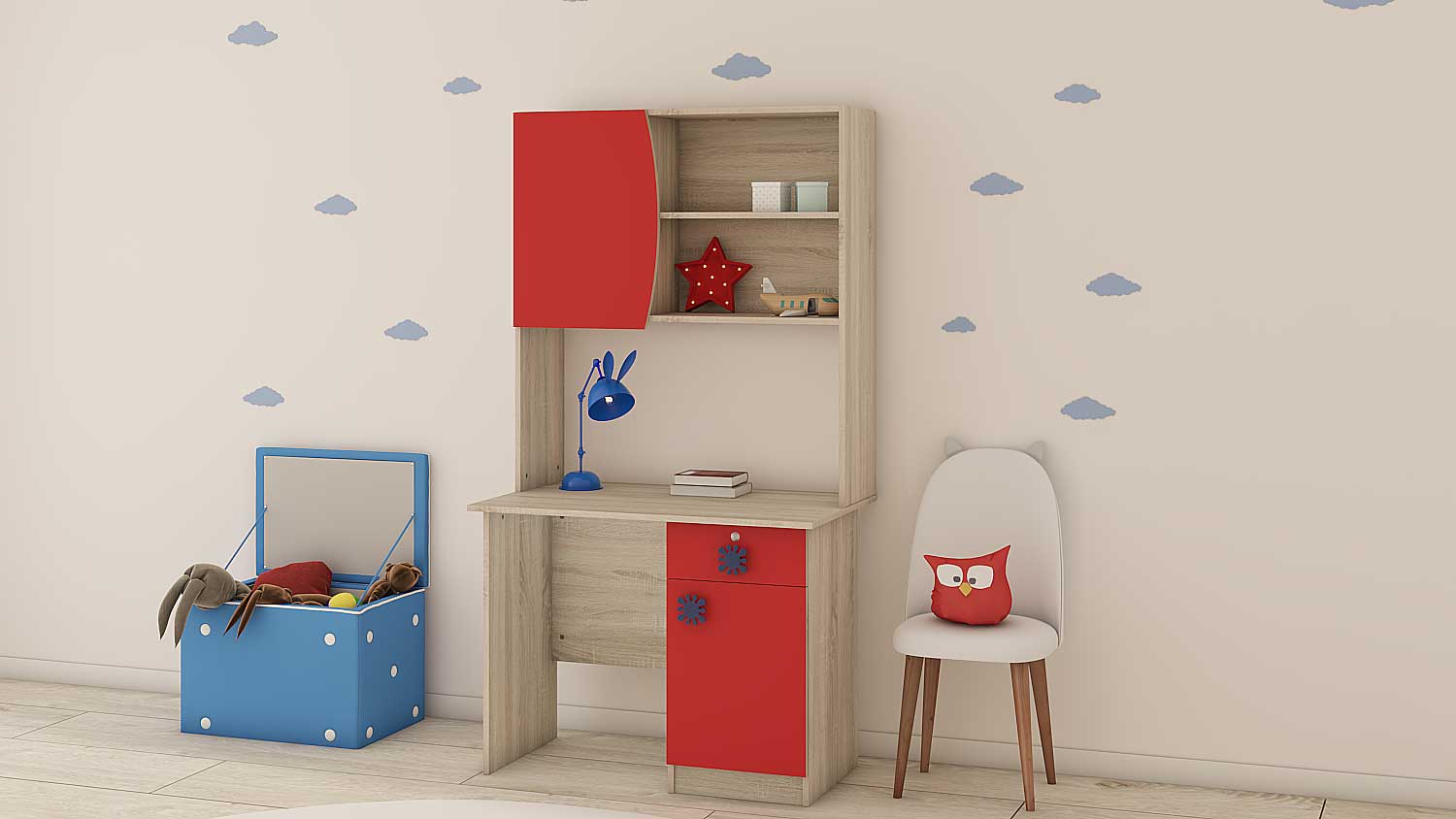 يضم المكتب خزانة علوية مغلقة للتخزين المنظم، رفوف مفتوحة لعرض الإكسسوارات أو الكتب، ووحدة تخزين سفلية، مثالي لإضفاء طابع مشرق على غرف الأطفال أو المساحات المنزلية.