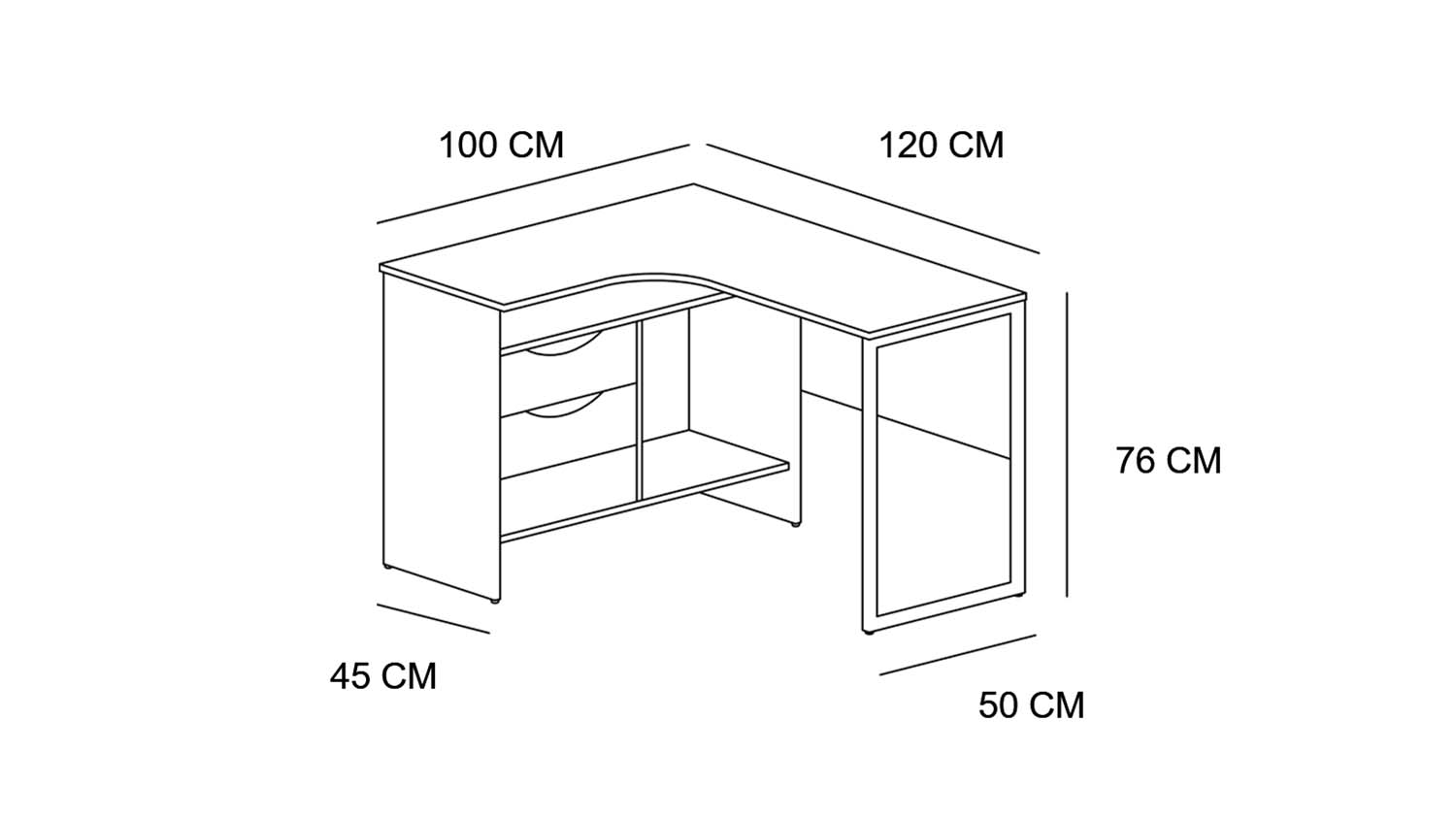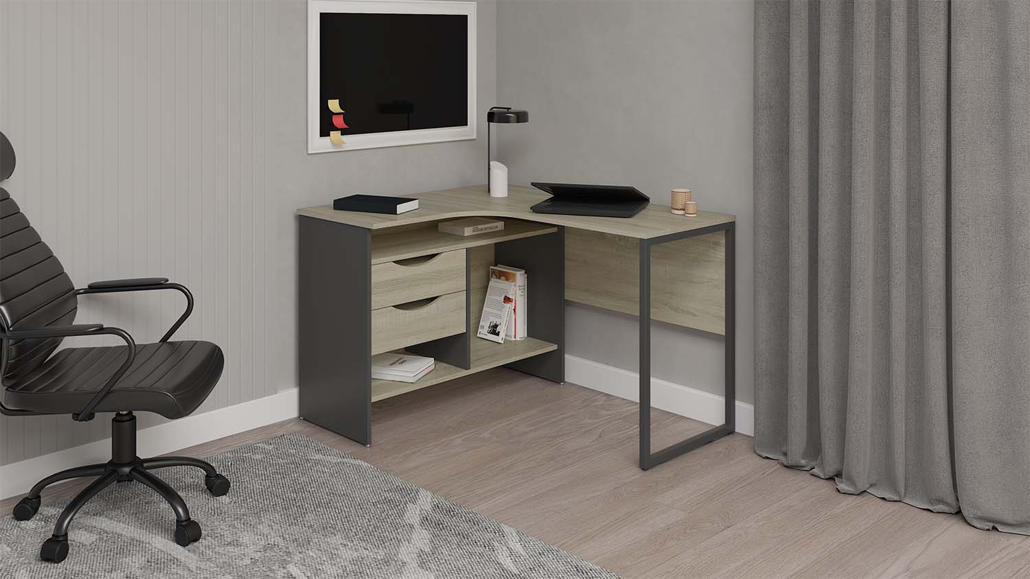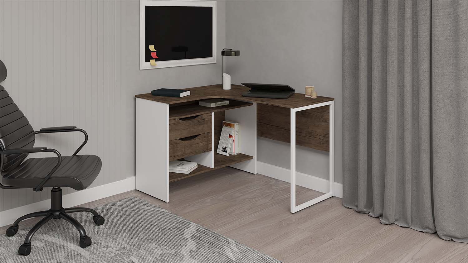 مكتب ستيل مودرن على شكل L بتصميم أنيق ومساحات تخزين عملية، مثالي للعمل أو الدراسة مع لمسة ديكور عصرية.